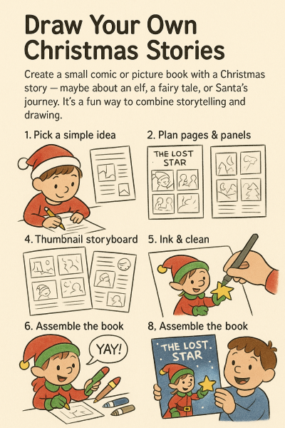 Create a small comic or picture book with a Christmas story — maybe about an elf, a fairy tale, or Santa’s journey. It’s a fun way to combine storytelling and drawing.